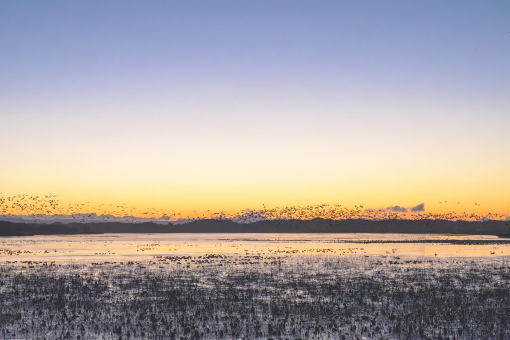 夜の色と朝の色が混ざり合う様子が表現されています。